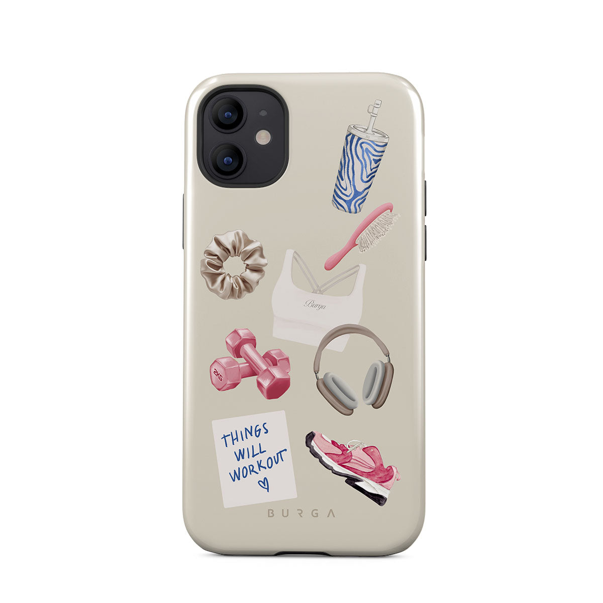 This design features: dumbbells, headphones, tumbler, hairbrush, pink trainers, sports bra, crunchie, "Things Will Work Out" sticky note