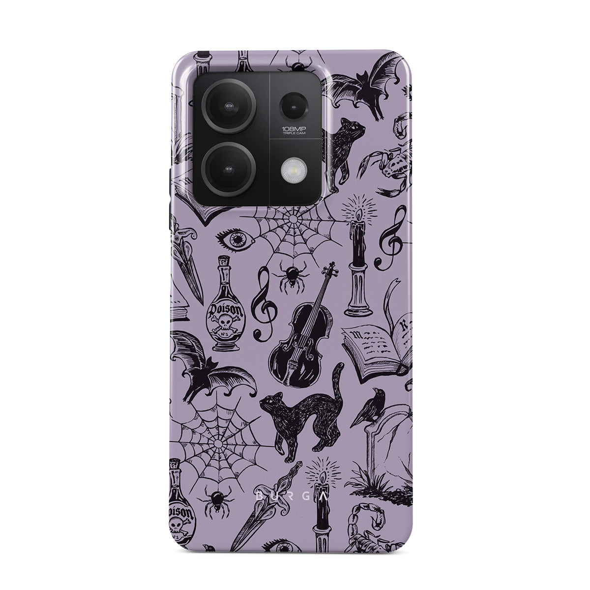 This design features: gothic doodles, mystical elements, spiders, spiderweb, cat, violin, eye, candle, dagger, book, bat, crow, scorpion