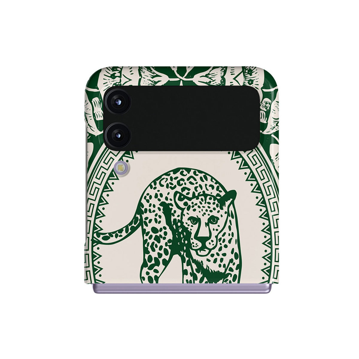 Our Antique Samsung Galaxy Z Flip 4 phone case designa nude canvas kissed by refined green contours, painting an eternal saga of elegance. Enthroned at its center is a regal leopard embraced by a tender floral caress. A nod to timeless opulence, this design captures the essence of vintage prestige.