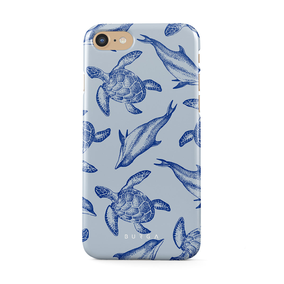 A beautiful design featuring lively turtles and dolphins playfully dancing in serene light blue water. Dive into the ocean's rhythm with our Aquatic Dance iPhone 7 / iPhone 8 case.