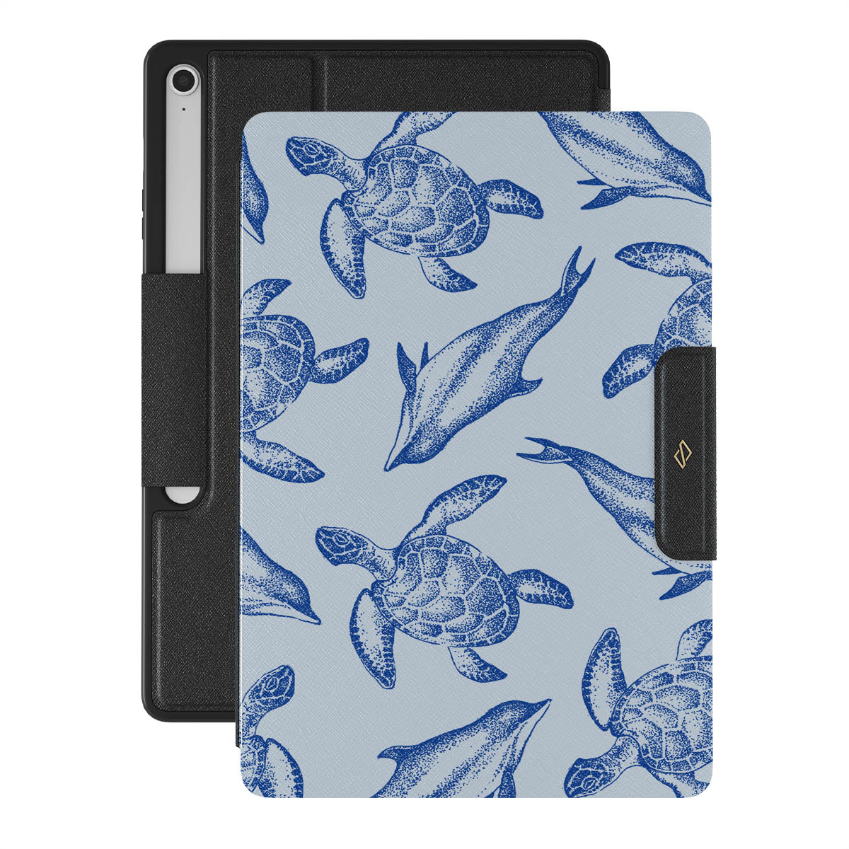 A beautiful design featuring lively turtles and dolphins playfully dancing in serene light blue water. Dive into the ocean's rhythm with our Aquatic Dance Samsung Galaxy Tab S10+ FE folio case.