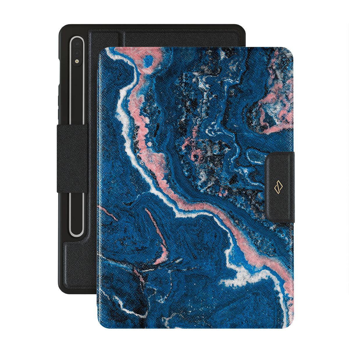 Electric indigo blue meets white, and pastel pink swirls in a unique marble pattern in our Blue Lagoon Samsung Galaxy Tab S9 FE folio case. The modern take on a blue marble trend will look aesthetically pleasing on your device while offering durable protection from any falls.
