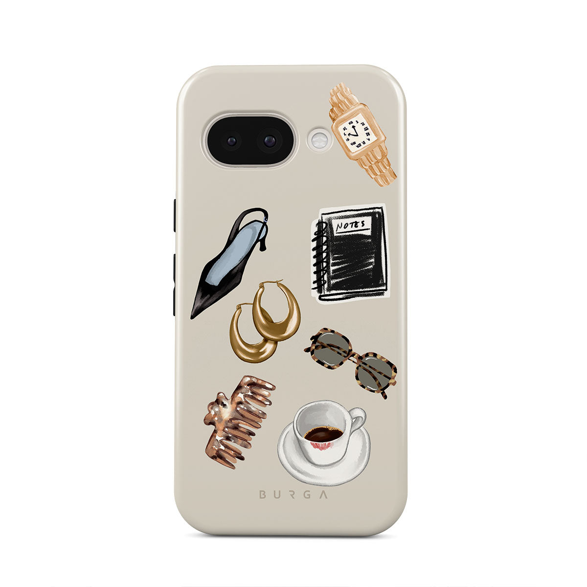 This design features: black high heel, gold hoop earrings, black notebook, coffee cup, tortoiseshell glasses, brown scrunchie, retro gold watch