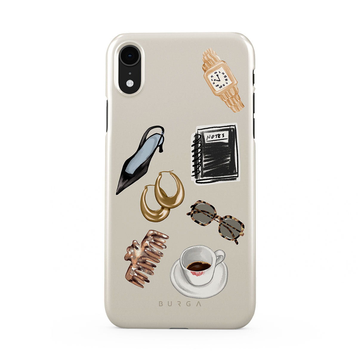 This design features: black high heel, gold hoop earrings, black notebook, coffee cup, tortoiseshell glasses, brown scrunchie, retro gold watch