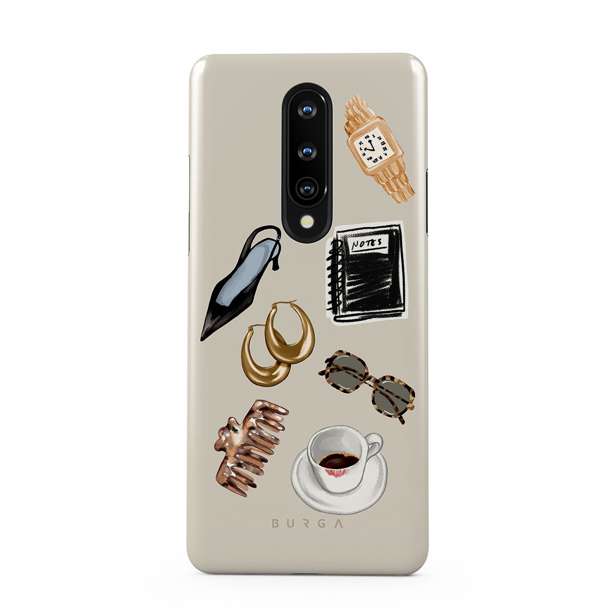 This design features: black high heel, gold hoop earrings, black notebook, coffee cup, tortoiseshell glasses, brown scrunchie, retro gold watch