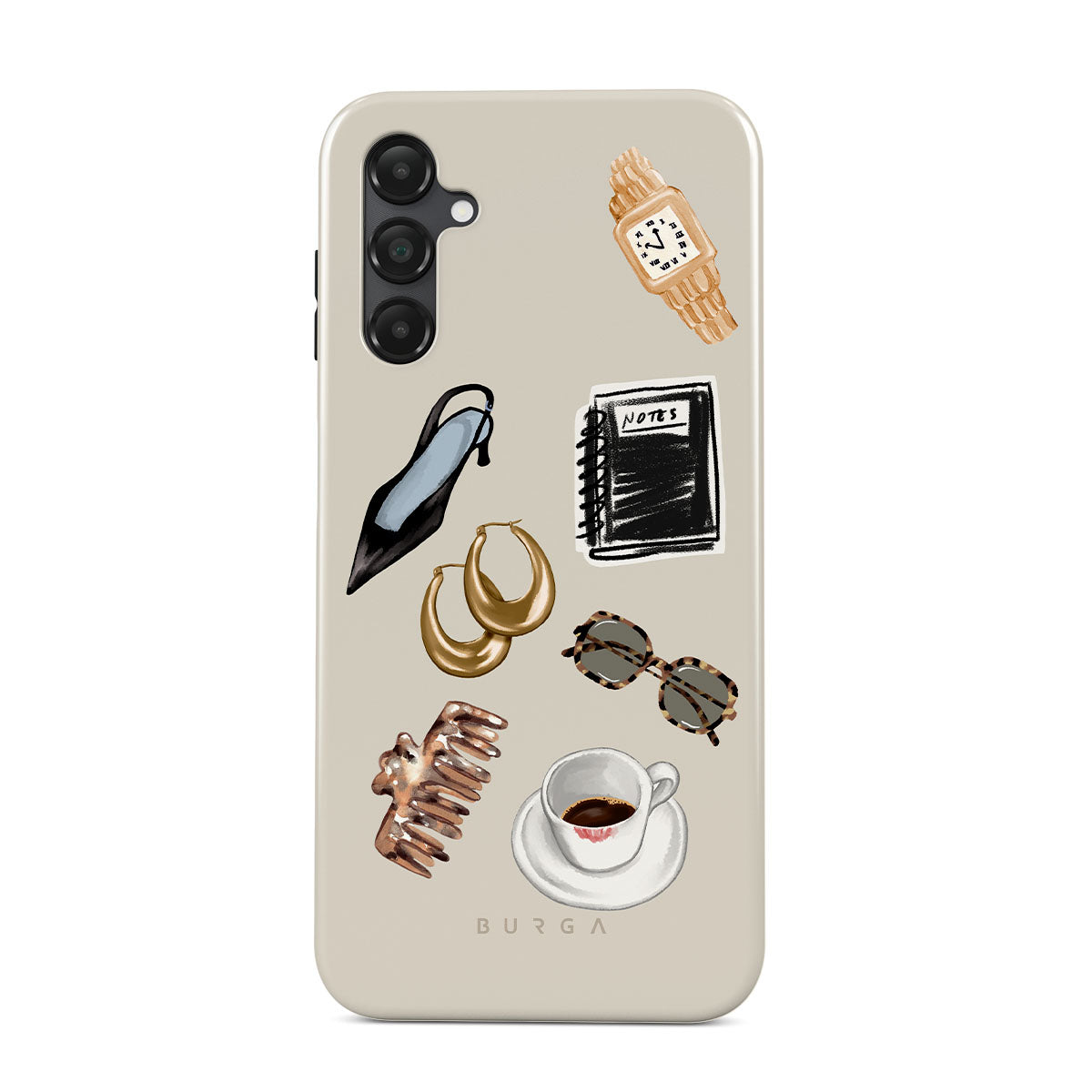 This design features: black high heel, gold hoop earrings, black notebook, coffee cup, tortoiseshell glasses, brown scrunchie, retro gold watch