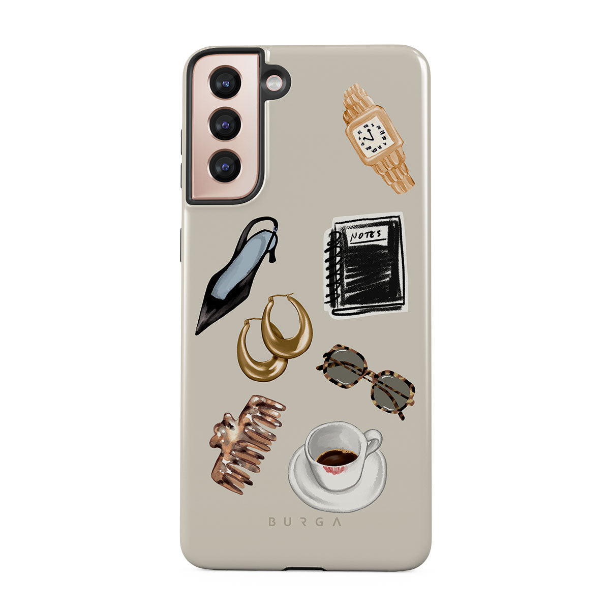 This design features: black high heel, gold hoop earrings, black notebook, coffee cup, tortoiseshell glasses, brown scrunchie, retro gold watch