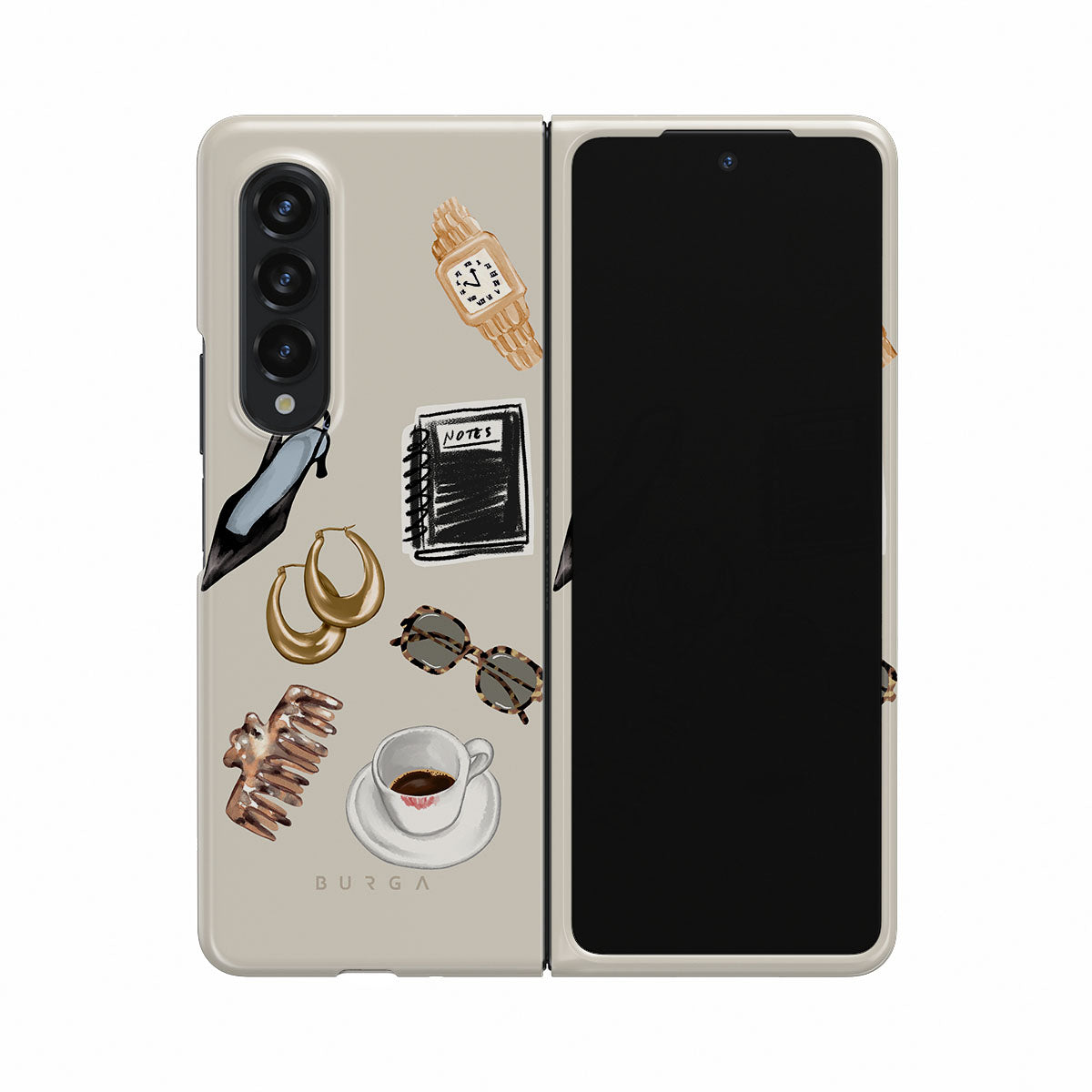 This design features: black high heel, gold hoop earrings, black notebook, coffee cup, tortoiseshell glasses, brown scrunchie, retro gold watch