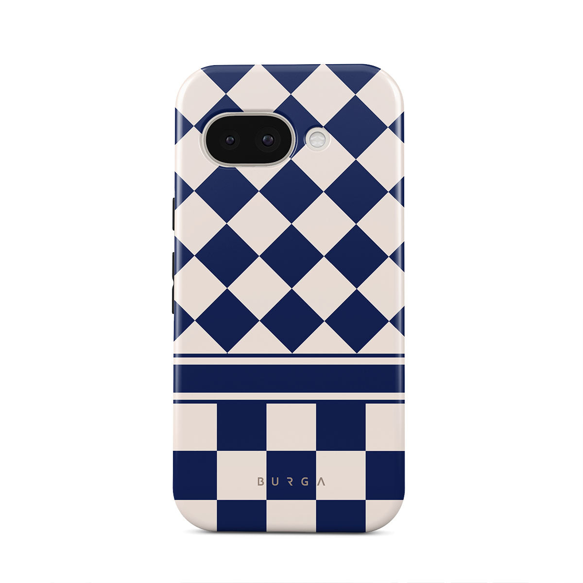 Embrace the essence of subtle luxury with our Check & Mate Google Pixel 9a phone case design. Blending eggshell and deep blue checkers, it evokes whispers of elegance. While diamonds grace the upper half, the lower half features a timeless chessboard pattern.