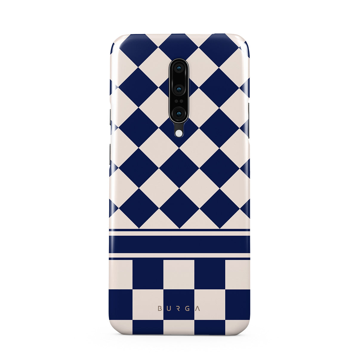 Embrace the essence of subtle luxury with our Check & Mate OnePlus 7 Pro / 7T Pro phone case design. Blending eggshell and deep blue checkers, it evokes whispers of elegance. While diamonds grace the upper half, the lower half features a timeless chessboard pattern.