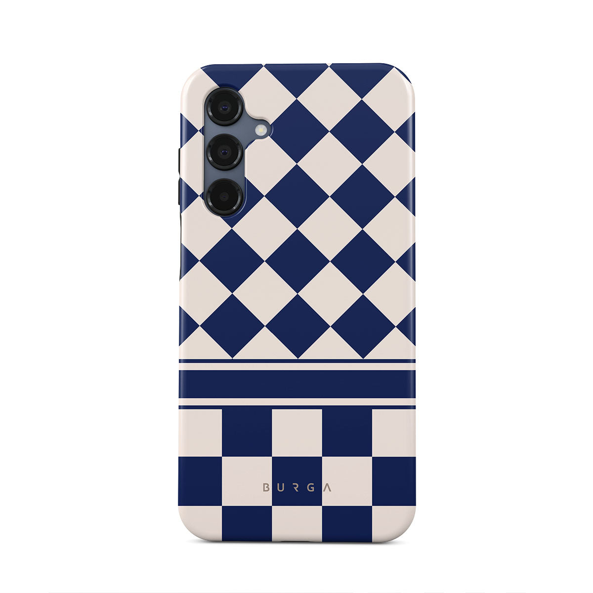 Embrace the essence of subtle luxury with our Check & Mate Samsung Galaxy A16 phone case design. Blending eggshell and deep blue checkers, it evokes whispers of elegance. While diamonds grace the upper half, the lower half features a timeless chessboard pattern.
