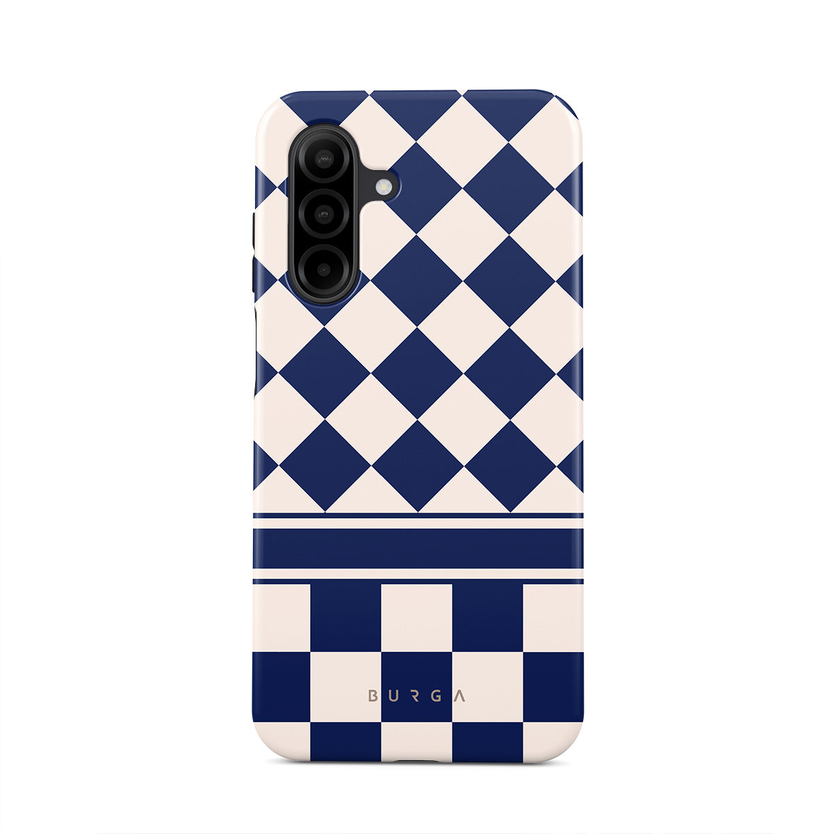 Embrace the essence of subtle luxury with our Check & Mate Samsung Galaxy A26 5G phone case design. Blending eggshell and deep blue checkers, it evokes whispers of elegance. While diamonds grace the upper half, the lower half features a timeless chessboard pattern.