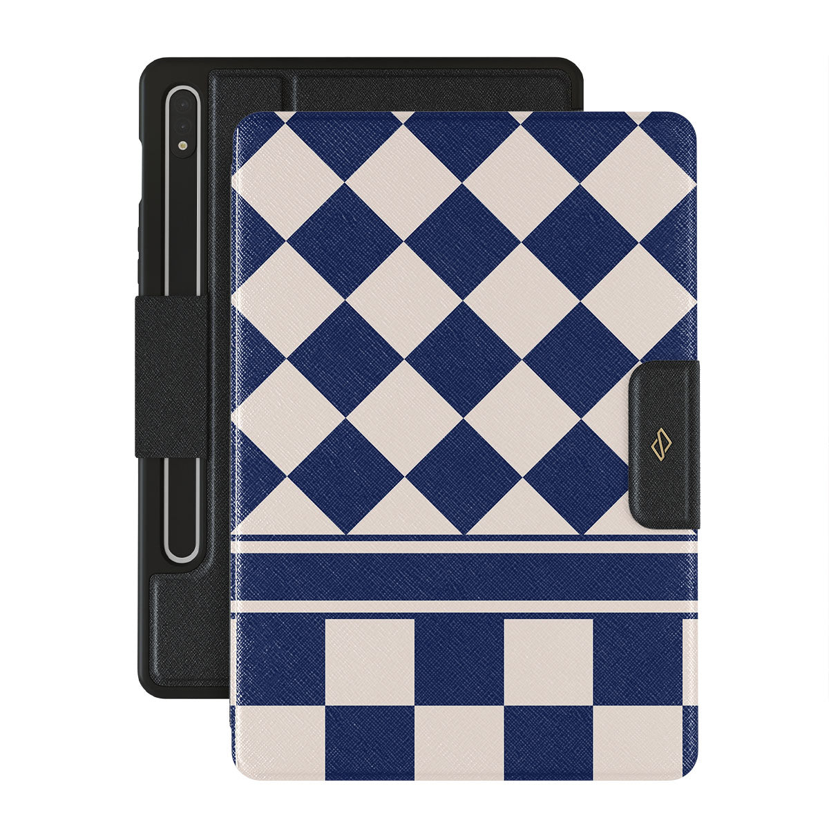 Embrace the essence of subtle luxury with our Check & Mate Samsung Galaxy Tab S8/S7 folio case design. Blending eggshell and deep blue checkers, it evokes whispers of elegance. While diamonds grace the upper half, the lower half features a timeless chessboard pattern.