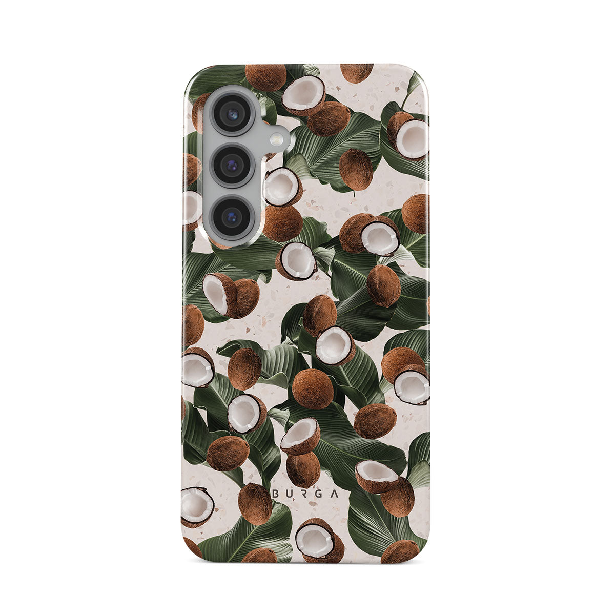 Coconut Crush Samsung Galaxy S24 Plus phone case showcases a soft creme color design with a playful addition of coconuts on top. The unexpected design duo will add a touch of tropical playfulness to your style while offering heavy-duty protection for your cell phone.