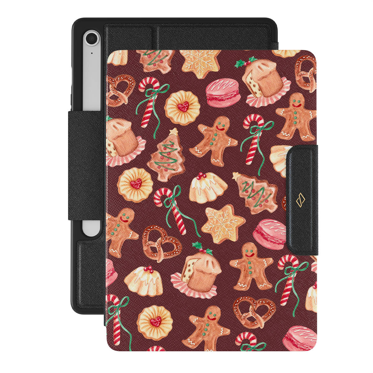 This design features: Christmas cookies, gingerbread men, candy canes, peppermint candies, festive sweets, burgundy red background