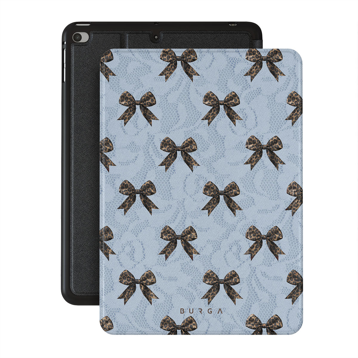 For those who command attention with subtle elegance, our Fashionista iPad Mini 7.9 (5th Gen) folio case design is your go-to. A soft blue background, accented by dark grey bows and subtle lace patterns, exudes polished, effortless style. It's quiet confidence with a hint of charm.