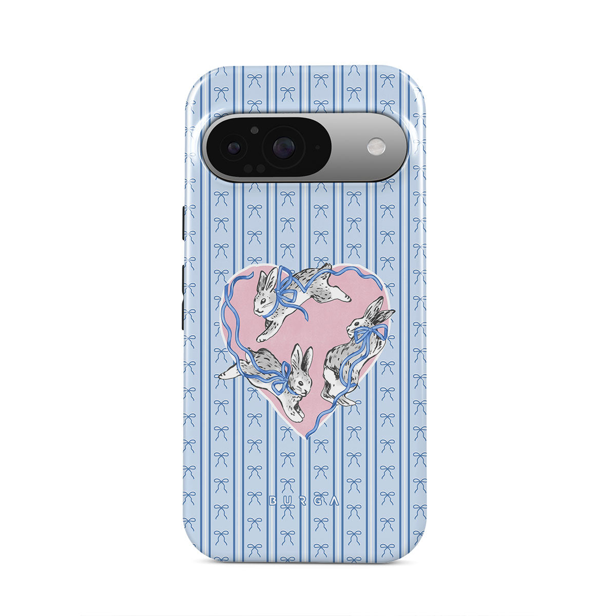 This design features: white rabbits, heart frame, blue stripes