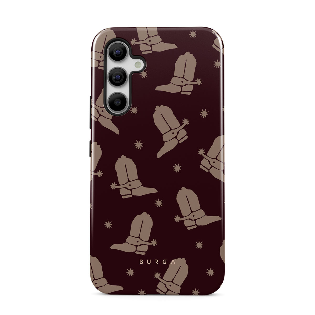 Say Howdy to this charming Samsung Galaxy A55 phone case design. Cowboy boots and stars dance across a deep brown background, celebrating the essence of western life. Perfect for those who embrace their free spirit.