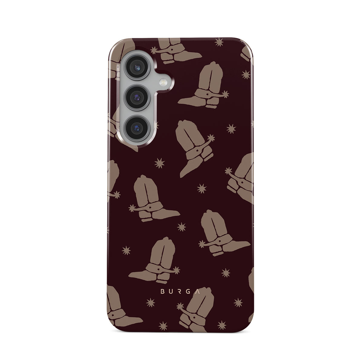 Say Howdy to this charming Samsung Galaxy S24 Plus phone case design. Cowboy boots and stars dance across a deep brown background, celebrating the essence of western life. Perfect for those who embrace their free spirit.