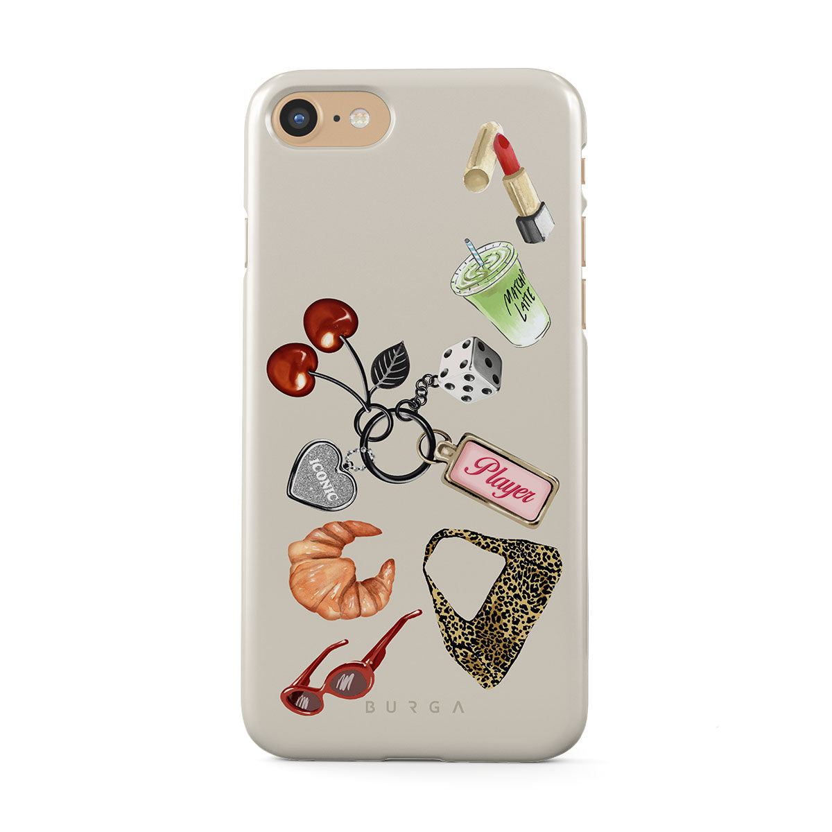 This design features: red sunglasses, red lipstick, green matcha drink, croissant, black dice, leopard-print bag, keychain with silver heart, cherries, dice and "Player" tag