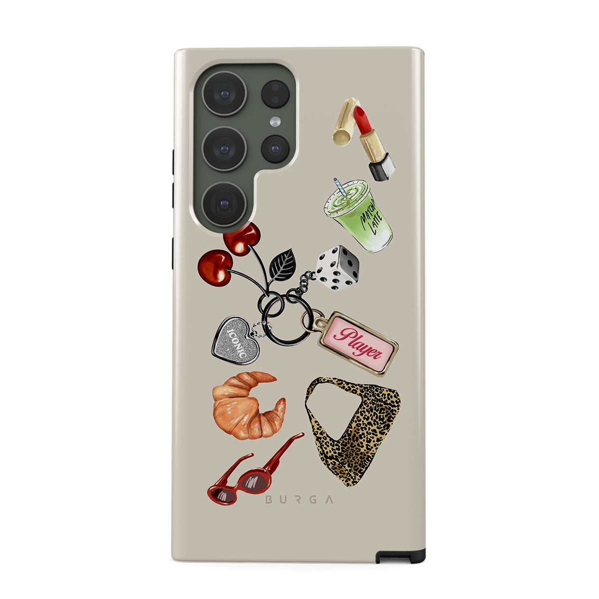This design features: red sunglasses, red lipstick, green matcha drink, croissant, black dice, leopard-print bag, keychain with silver heart, cherries, dice and "Player" tag