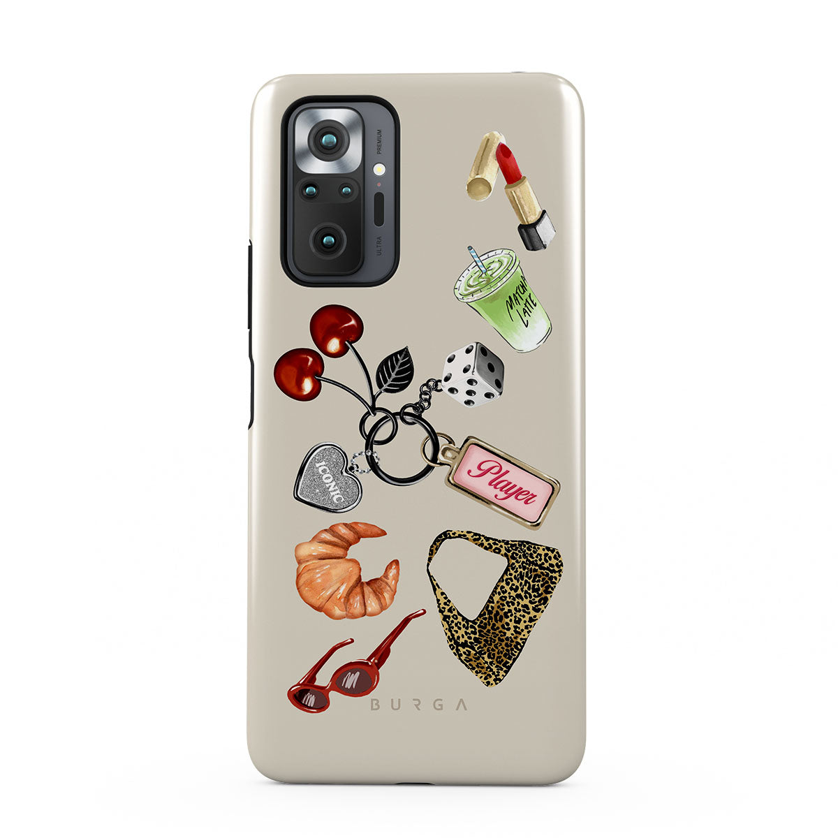 This design features: red sunglasses, red lipstick, green matcha drink, croissant, black dice, leopard-print bag, keychain with silver heart, cherries, dice and "Player" tag