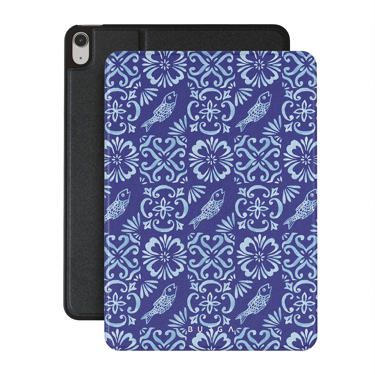 This design features: Portuguese tile patterns, deep blues, floral patterns, flowers, fish