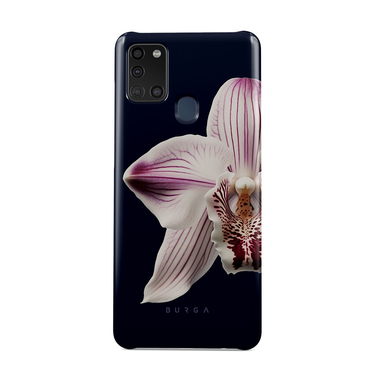The white orchid blooms boldly upon a night sky blue, a beacon of clarity in the darkness. Our Nectar Samsung Galaxy A21s 4G phone case design speaks to the soul's desire to find light within, to illuminate the hidden paths of self-discovery that only reveal themselves under the cloak of introspection.