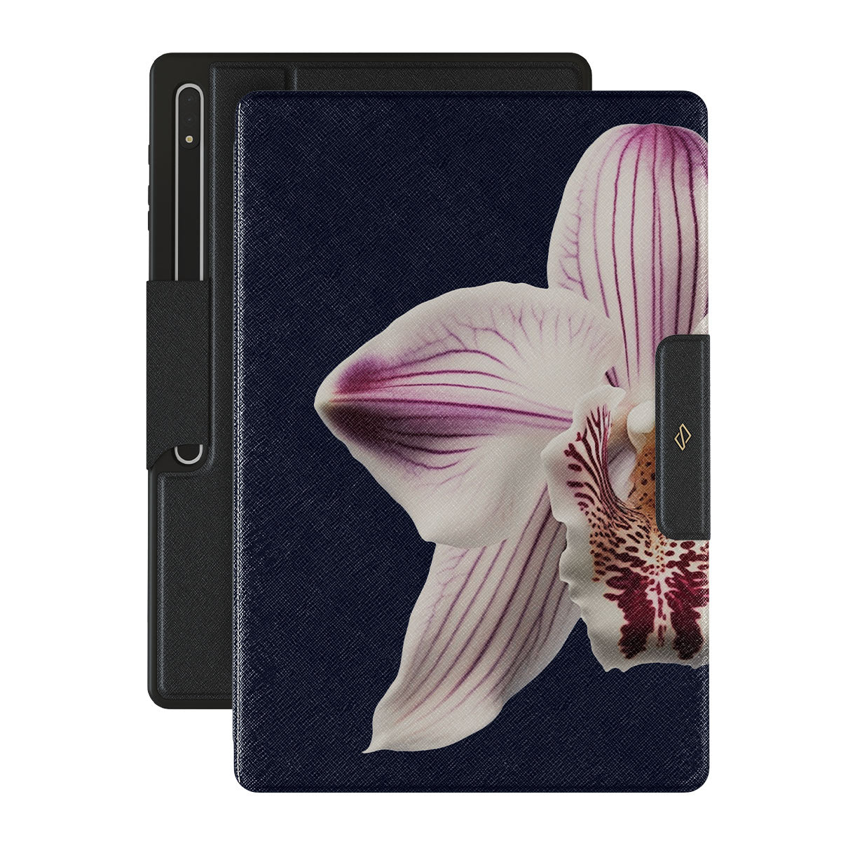 The white orchid blooms boldly upon a night sky blue, a beacon of clarity in the darkness. Our Nectar Samsung Galaxy Tab S10 Ultra folio case design speaks to the soul's desire to find light within, to illuminate the hidden paths of self-discovery that only reveal themselves under the cloak of introspection.