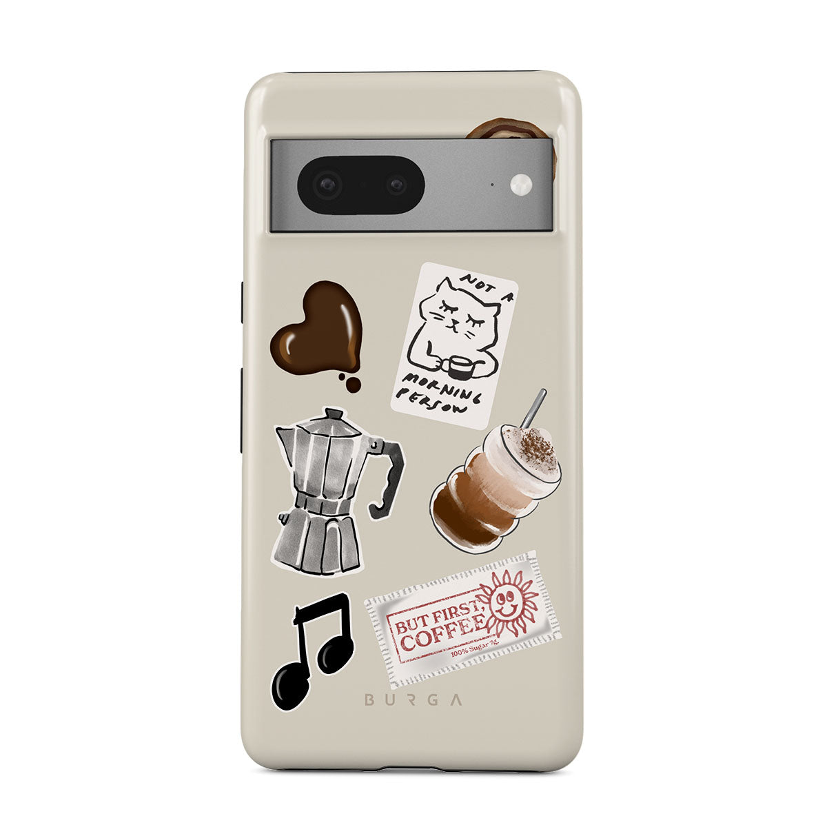 This design features: moka pot, frappe, cinnamon roll, chocolate heart, "Not a morning person" sticker, "But First, Coffee" receipt, music note