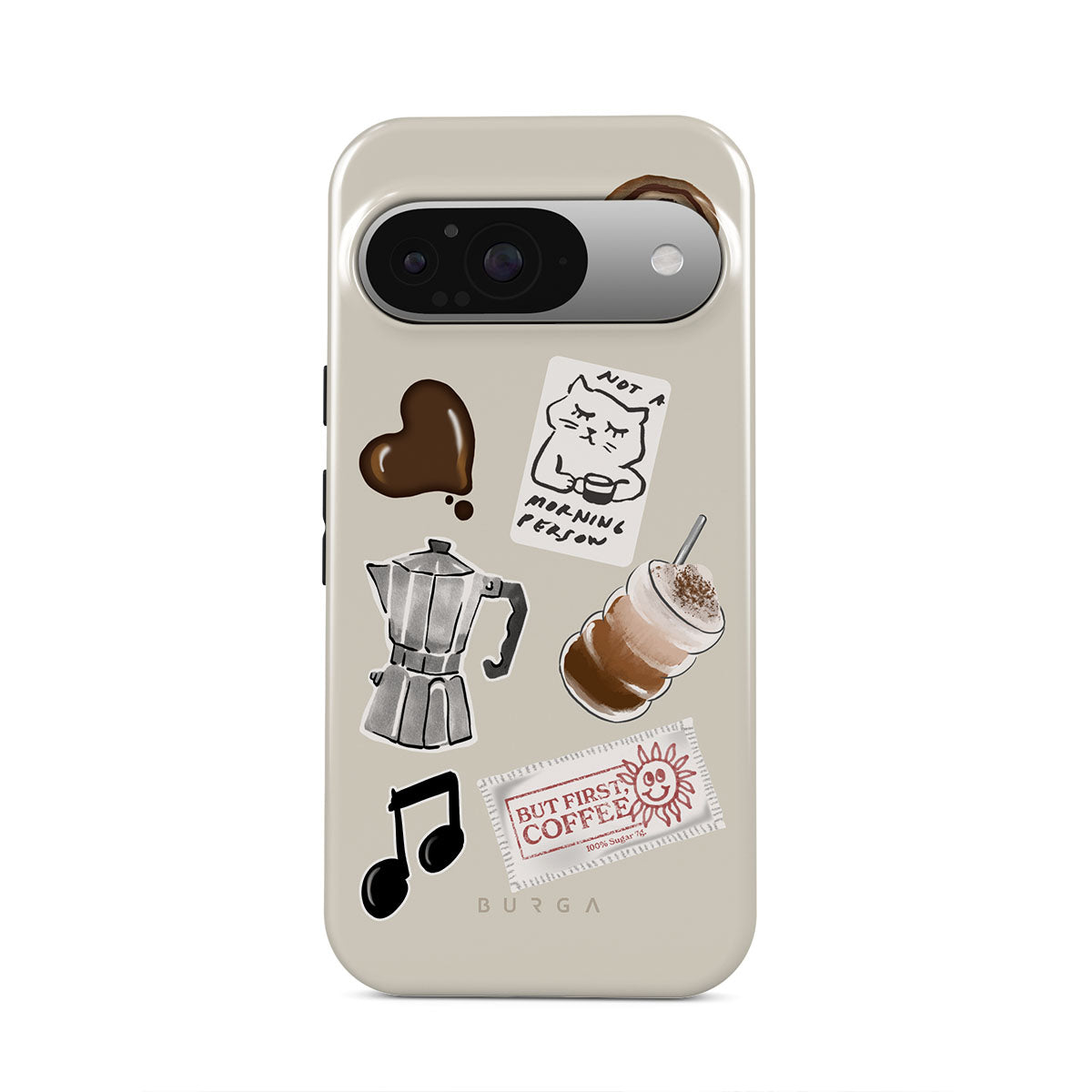 This design features: moka pot, frappe, cinnamon roll, chocolate heart, "Not a morning person" sticker, "But First, Coffee" receipt, music note