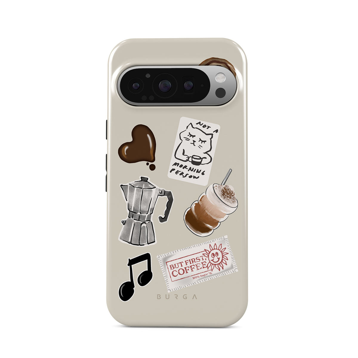 This design features: moka pot, frappe, cinnamon roll, chocolate heart, "Not a morning person" sticker, "But First, Coffee" receipt, music note
