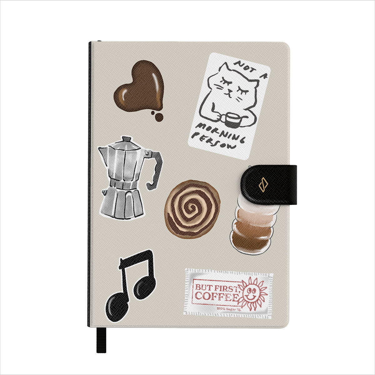 This design features: moka pot, frappe, cinnamon roll, chocolate heart, "Not a morning person" sticker, "But First, Coffee" receipt, music note.