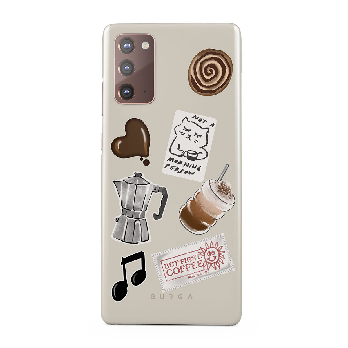 This design features: moka pot, frappe, cinnamon roll, chocolate heart, "Not a morning person" sticker, "But First, Coffee" receipt, music note