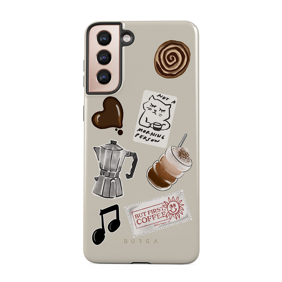 This design features: moka pot, frappe, cinnamon roll, chocolate heart, "Not a morning person" sticker, "But First, Coffee" receipt, music note