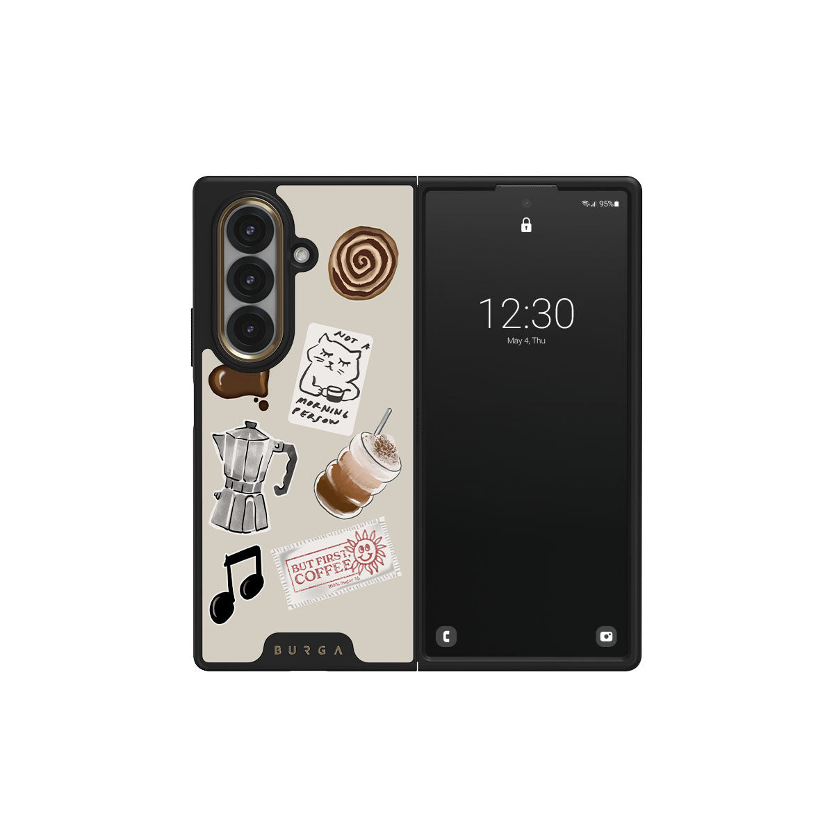 This design features: moka pot, frappe, cinnamon roll, chocolate heart, "Not a morning person" sticker, "But First, Coffee" receipt, music note