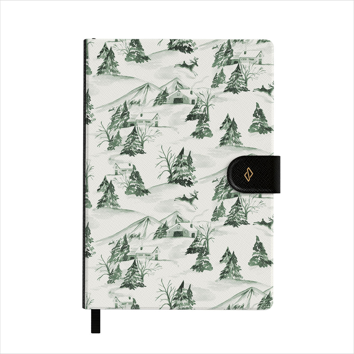 This design features: winter forest scene, pine trees, snowy landscape, green and white, nature pattern, woodland Christmas, evergreen trees, vintage illustration style
