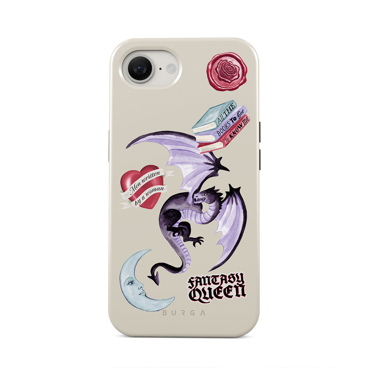 This design features: purple dragon, "Fantasy Queen" sticker, crescent moon, purple wax seal, heart with message, books
