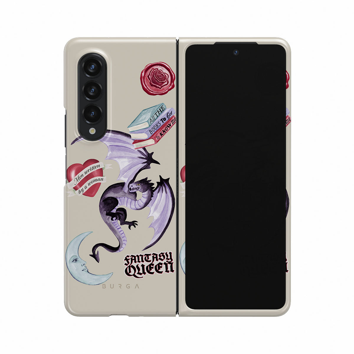This design features: purple dragon, "Fantasy Queen" sticker, crescent moon, purple wax seal, heart with message, books