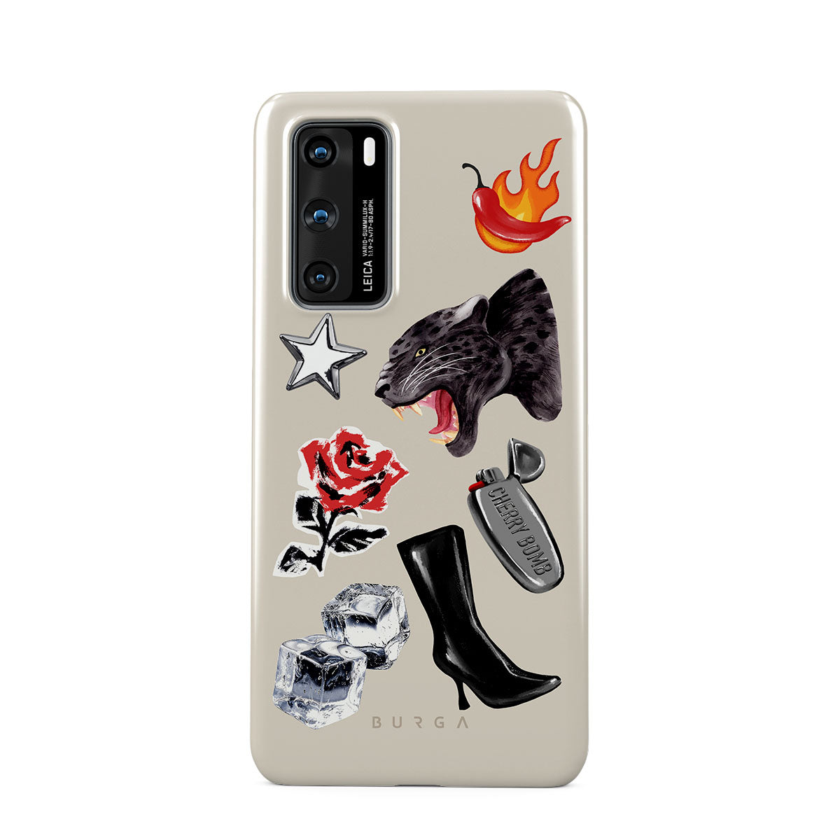 This design features: black panther, red rose, burning bell pepper, silver lighter, black knee-high boots, ice cubes, silver star