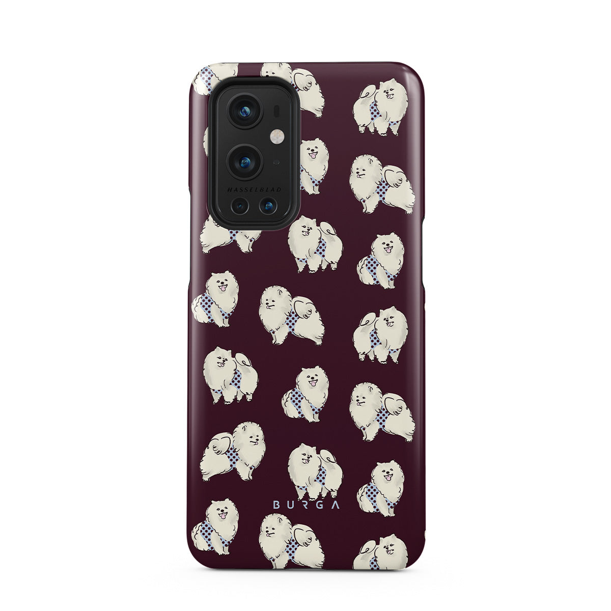 This design features: white fluffy dogs on a deep burgundy background, poodles, pets.