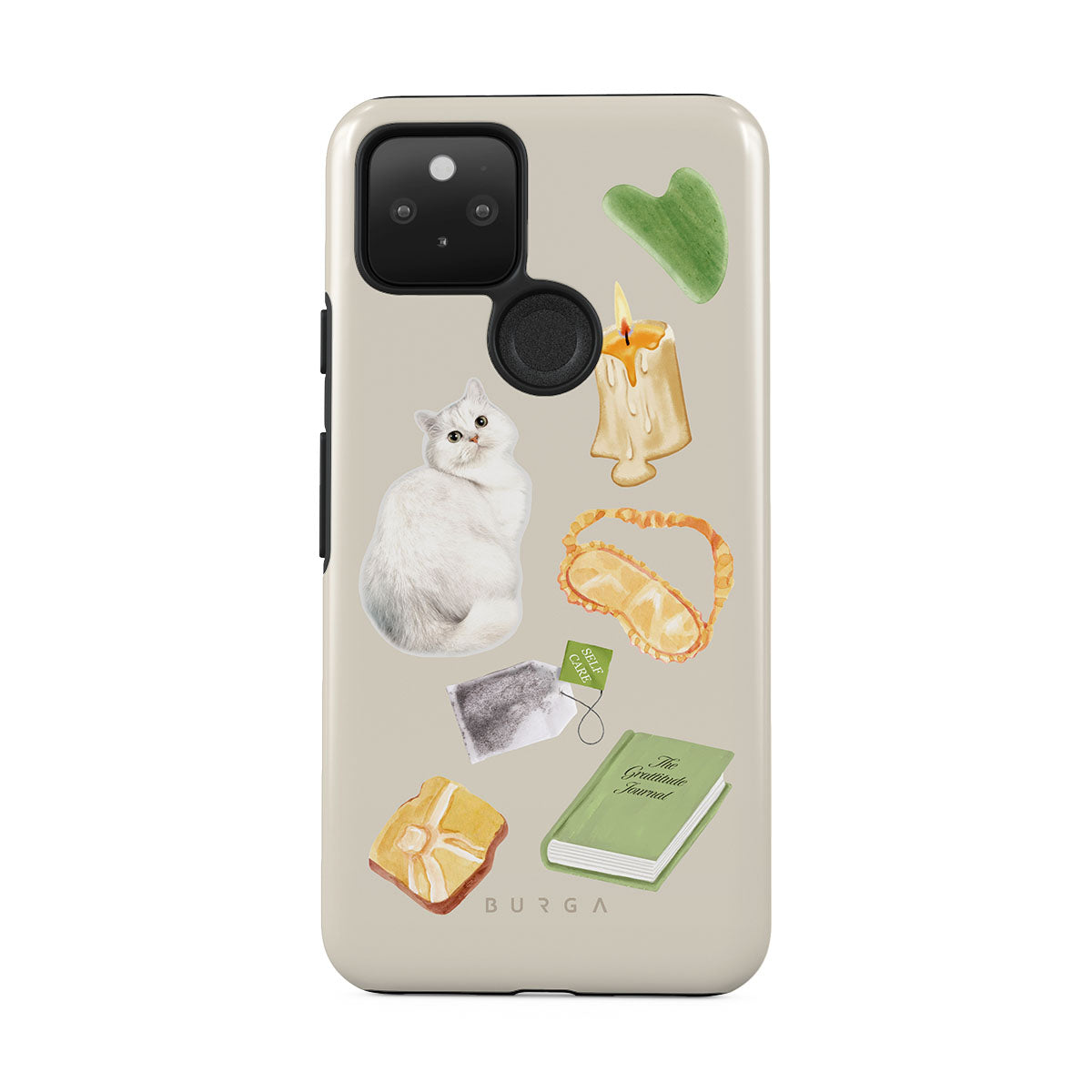 This design features: white cat, green book, candle, Gua Sha bar, sleeping mask, tea bag, yellow crystal