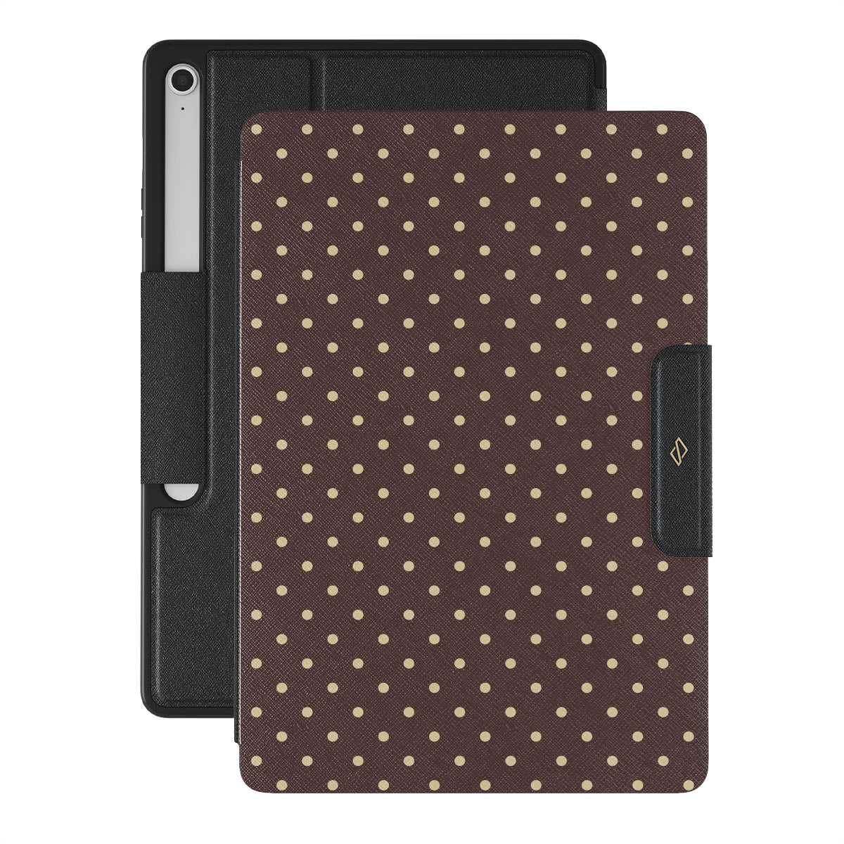 Playful yet polished, our Sorry Busy Samsung Galaxy Tab S10+ FE folio case design features a warm brown background sprinkled with delicate beige polka dots, blending charm with a professional edge. It's for those who keep it stylish, even when fully booked and thriving.