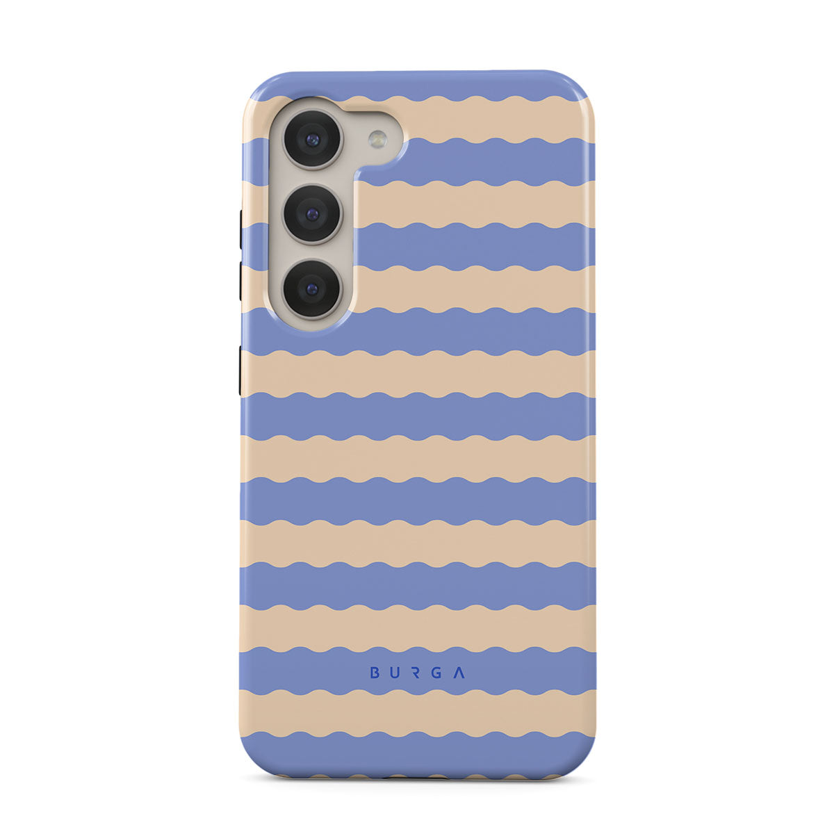 Dive into the cool, refreshing style of our Splash design–a dynamic Samsung Galaxy S23 phone case featuring playful, wavy stripes of serene ocean blue and soft sandy beige. Perfect for those who love to make a splash with their accessories.