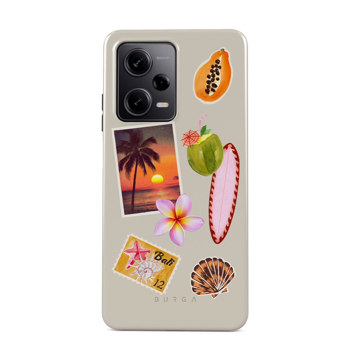 This design features: tropical sunset photo, papaya, green coconut, pink surfboard, pink plumeria flower, orange shell, Bali postcard