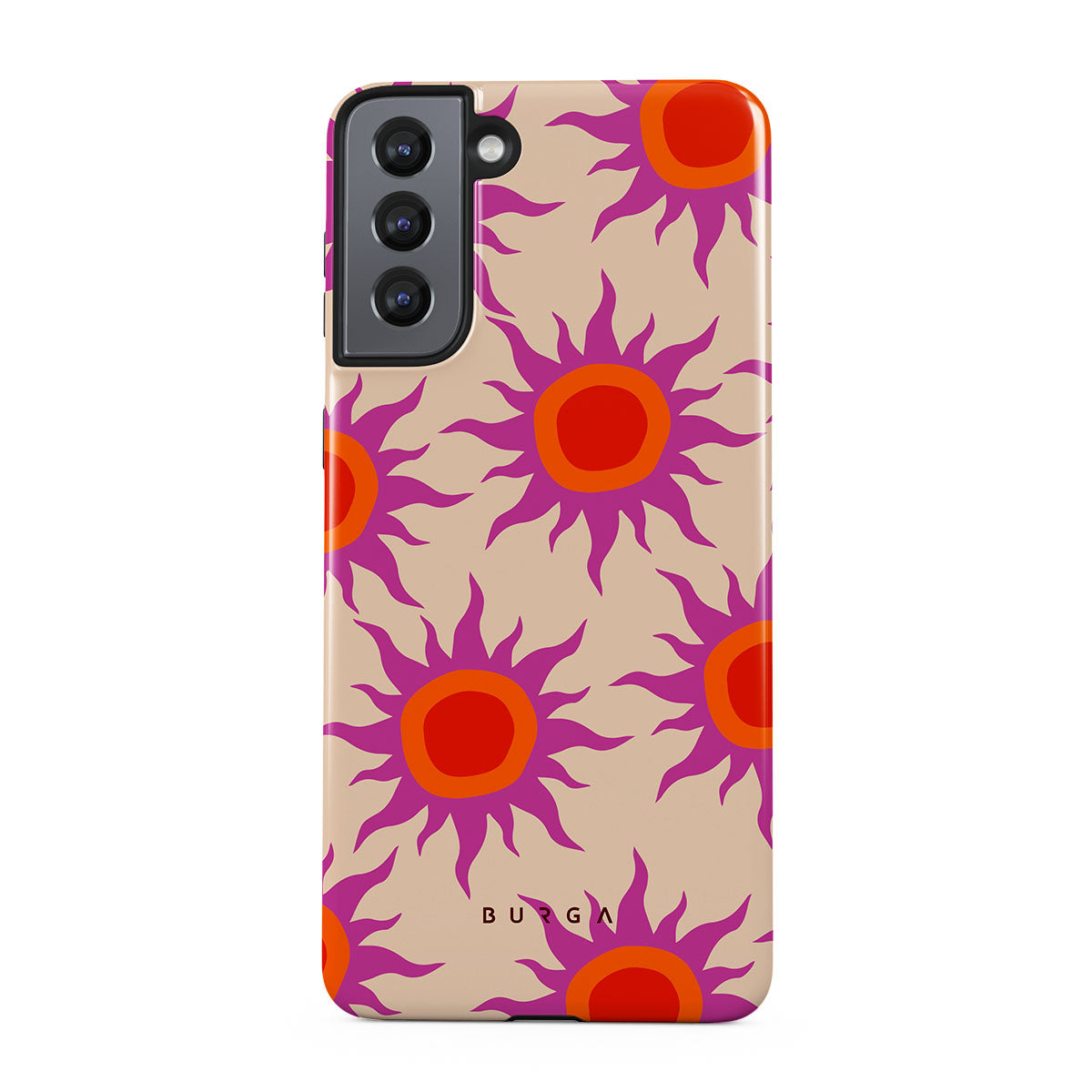 Discover the radiant serenity of the Sunset Glow design, a harmonious blend of soothing pastels and fiery suns. Vivacious viva magenta rays add a playful touch, perfectly balancing tranquility and dynamism. More than just a fashion accessory, this striking Samsung Galaxy S21 phone case mirrors your unique personality and zest for life.