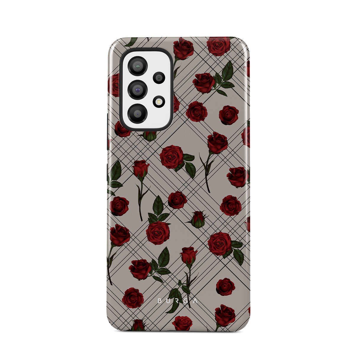 Embrace the subtle rebellion of our Sweet Sin Samsung Galaxy A33 phone case design. On a muted nude-gray canvas, scattered small red roses hint at passions hidden beneath the surface. A design that balances the delicate with the daring. Crafted for those who find beauty in the unexpected and wear their edge with elegance.