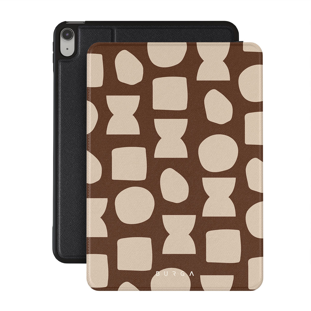 Our Terracotta iPad 10.9 (A16/10th Gen) folio case design whispers warmth and grounded energy. Against a rich brown background, an interplay of light shapes unfolds, captivating the eye with an array of circles, squares, and hourglasses. Each shape is a testament to the beauty found in simplicity.