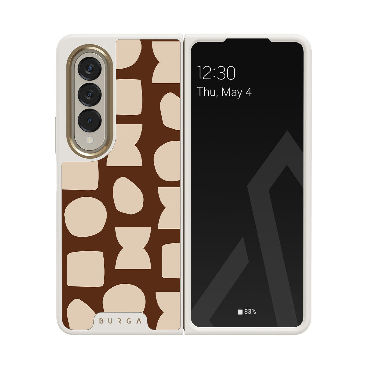 Our Terracotta Samsung Galaxy Z Fold 4 phone case design whispers warmth and grounded energy. Against a rich brown background, an interplay of light shapes unfolds, captivating the eye with an array of circles, squares, and hourglasses. Each shape is a testament to the beauty found in simplicity.