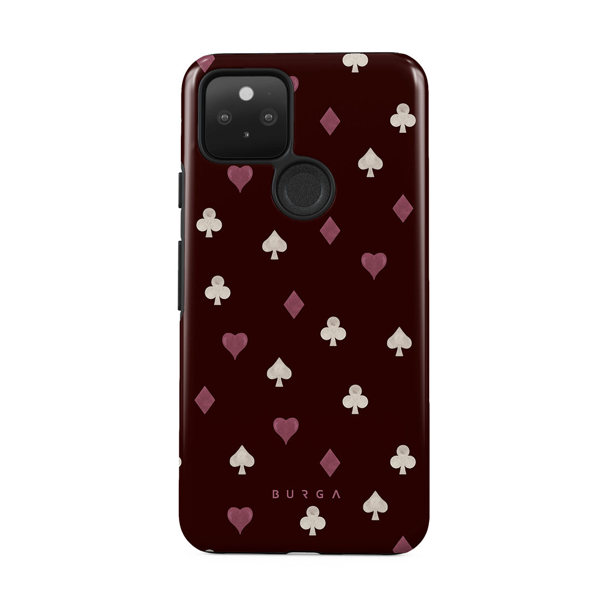 Nothing is as it appears. Hearts, clubs, diamonds, and spades—stacked in your favor or playing against you? This Google Pixel 5 phone case design features a rich burgundy background and minimalist suits that make for a game where the rules are constantly shifting.
